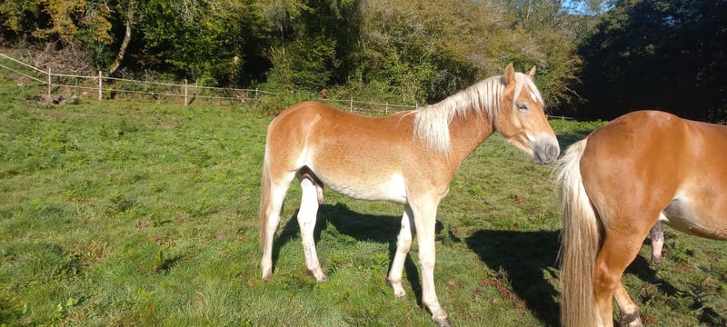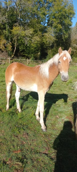✨ For sale: Haflinger stallion Mondain de L’Espaud (in foal or without foal) ✨ Name: Mondain de L’Espaud Breed: Haflinger (1.40 m+) Year of Birth: April 13, 2024 (1.5 years) Color: Chestnut Pedigree: Sire Morgenstern / Liz 5567/T – Dam Sonnenstrahl - dam's sire Sevruga Liz 410/T Mondain is a beautiful, intelligent stallion foal with a sporty, large Haflinger build. 👉 Character & Potential Mondain is sensitive, eager to learn, and loyal when he trusts you. He requires an owner who has experience with (holistic) ethology or horsemanship. With the right guidance, he will grow into a cheerful and loyal partner. Without that approach, he may withdraw and become insecure, potentially choosing to be aggressive. 👉 Training & Disciplines Started groundwork, leads well with a halter and on a lead rope. Grooming. Versatile use: Breeding, recreation, dressage, jumping, driving work, TREC, or Equifeel. 👉 Health & Living Environment Up to date with vaccinations, deworming. Lives outside year-round in herds, very social and well acclimatized. 💶 Price Mondain de L’Espaud € 2950,- including VAT. 📍 Available for viewing in Haute-Vienne (87), France. Accommodation available – these costs will be waived upon purchase. With a heavy heart, we are selling him due to lack of time and already having one stallion. MONDAIN will only go to a 5-star home where he will receive the right attention and guidance. ℹ️ We currently have five more Haflingers for sale, with and without papers (ages 1 to 5 years).