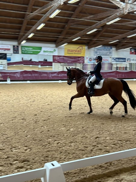 Feivi has been with me since he was 6 months old. I personally broke him and trained him up to S-level. He is a true buddy-type, equipped with three good gaits, very affectionate and cuddly, and a pleasure to ride. He has already won medium-level dressage tests at competitions and is always a reliable partner. He also enjoys and handles solo rides very well. Since I no longer have enough time for him, I am sadly looking for a new 5-star home. I can easily see him as a pony transition horse and schoolmaster. The main thing is finding a family that will appreciate him just as much as we do. As he is not very tall, a larger rider might not be the best fit. Due to an existing health issue, he is offered at a significantly reduced price. Quality over price is my motto. Videos and further information are available upon request.