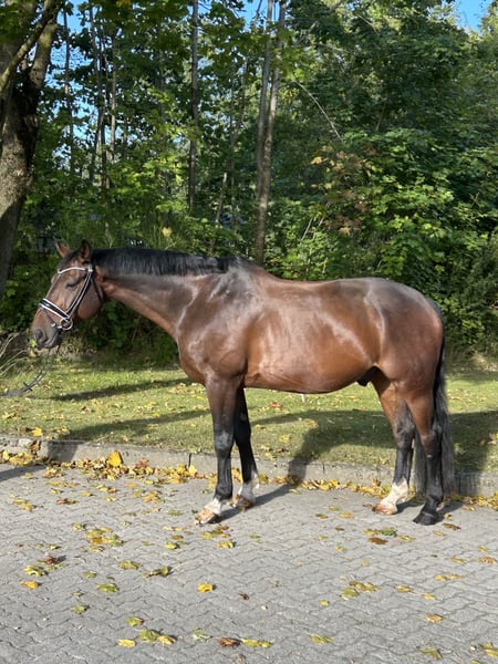 Zum Verkauf steht ein ausgesprochen lieber und ehrlicher 11-Jähriger Wallach aus bewährter hannoverscher Abstammung (Rotspon – Wittinger). Er misst ca. 167 cm und überzeugt durch seine angenehme Art und sein ausgeglichenes Wesen. Ein echtes Verlasspferd im Alltag. „Rudi“ zeigt sich im Umgang wie auch unter dem Sattel stets brav, geduldig und nervenstark. Er wird aktuell von einem jungen Mädchen sowie auch von Reitanfängern geritten und macht dabei immer einen tollen Job. In der Arbeit zeigt er sich zuverlässig, er beherrscht fliegende Wechsel und weitere M-Lektionen. Auch im Springen wurde er zu Hause bis etwa 1 m gefördert, ohne weitere Ambitionen. Er geht alleine und in der Gruppe entspannt ins Gelände, ist schmiede- und verladefromm sowie vorne beschlagen. Eine klinische AKU ohne Befunde liegt von vor 4 Jahren vor. Röntgenbilder wurden bisher nicht angefertigt, weil er immer gesund war. Ein tolles Pferd für Reiter, die einen zuverlässigen, sicheren und gut ausgebildeten Partner für Dressurarbeit, Springen und Gelände suchen. Für weitere Fragen oder ein Kennenlernen melden Sie sich gerne telefonisch oder per WhatsApp unter 01725817647