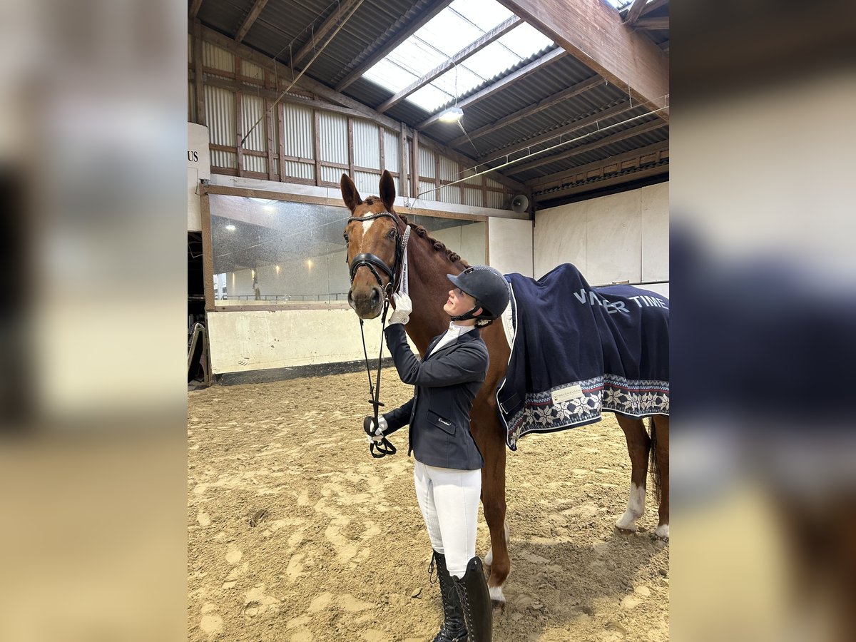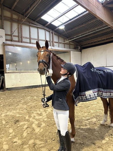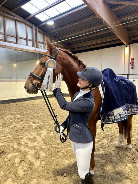 11- jähriger Wallach von Spörcken x Welser. Im Umgang ein absolutes Familienpferd. Er befindet sich im Training auf L*/** Niveau. Außengalopp, einfache Galoppwechsel und Trasversalen sind sehr sicher. Von zwei gemeinsamen Turnierstarts in L* auf Trense und L* auf Kandare brachte er zwei Schleifen (2.Platz und 4.Platz) mit nach Hause. Er hat sehr viel Spaß an abwechslungsreicher Arbeit, in der er gefordert und gefördert wird. Simba geht gerne ins Gelände und ist Schmiede- und Verladefromm.