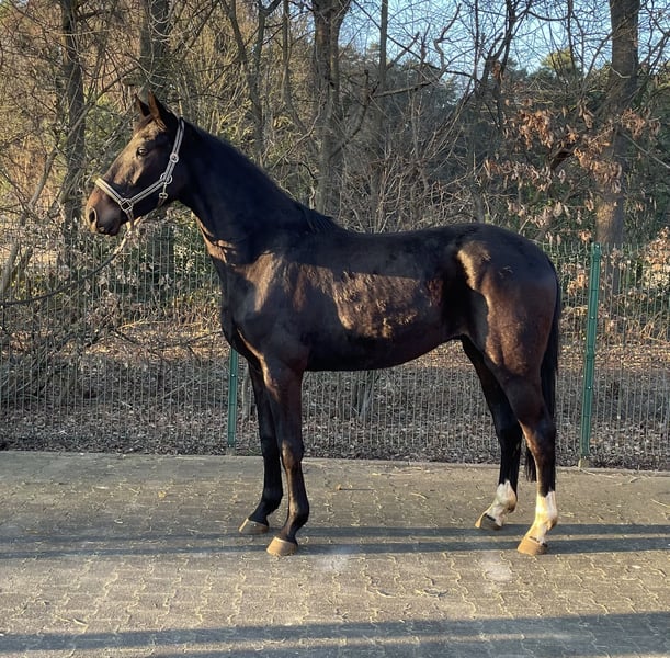 Sehr schicker moderner Typ, jetzt 3-jährig gewordener schwarzbrauner Wallach mit drei sehr guten GGA, er kennt noch nicht viel da er vor kurzem aus einer kleinen Herde und den Stall reingekommen ist. 1,66m groß und lieb im Umgang.