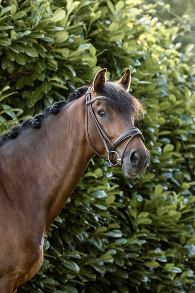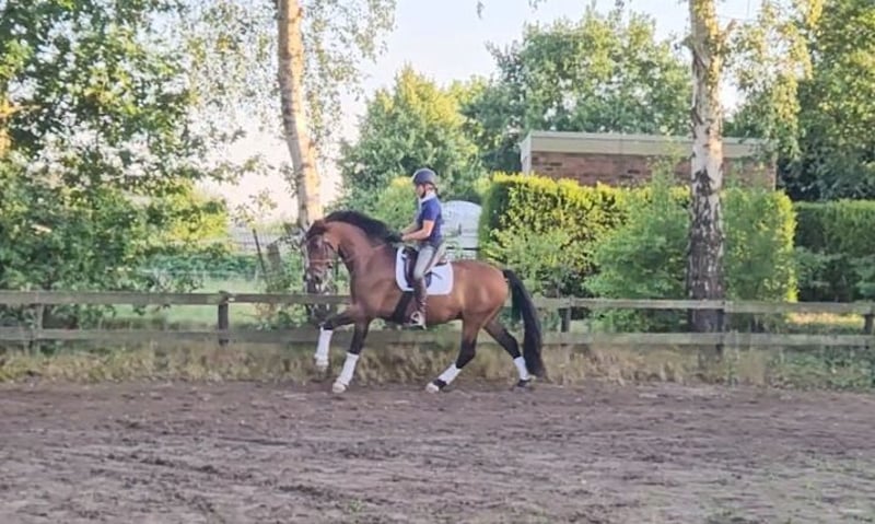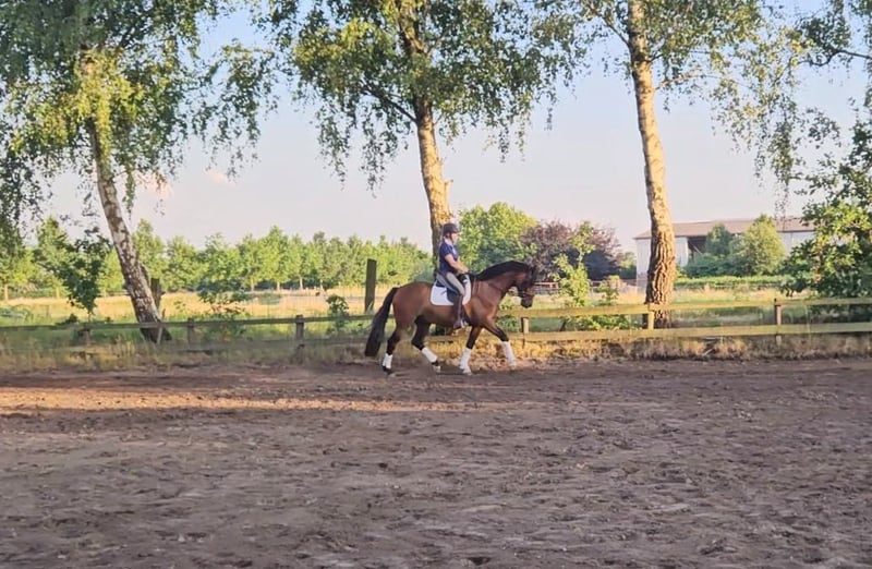 **Stylish*Brave*Rideable*Talented** For sale is a Hanoverian gelding, born in 2021. With a current height of 165 cm (but covers well, rider 1.78m), this brown beauty is in excellent condition and ready for new challenges. He has a great character and is uncomplicated and well-mannered in handling. He comes directly from the breeder and has never been sick a day in his life. He impresses with his balanced and friendly nature as well as his potential in dressage. The gelding already shows promising progress in his training and has a high willingness to learn. Since the beginning of the year under saddle, he has completed the Dressage Horse A level. For jumping, he shows talent and has the appropriate canter, but has not yet been further developed in that area. He is familiar with going out alone and performed very well during his first off-site training, from loading to riding. He is currently still barefoot. This horse is ideal for riders looking for a promising dressage horse that can shine both in training and at competitions. Due to his character, he is suitable for both ambitious amateur riders and those who have aspirations in the competition sport and wish to further develop him (mother and all siblings have been successful in sports). If you are interested or need further information, please feel free to contact me. Viewings and trial rides are possible by arrangement. X-ray images are available.