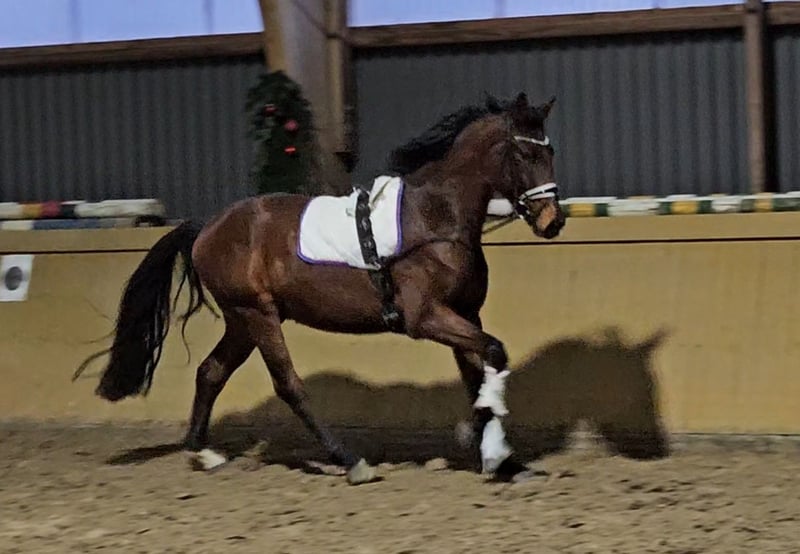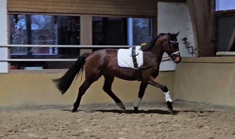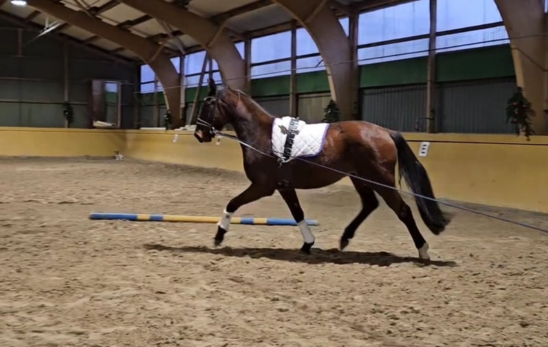 Bewegungsstarker Wallach aus eigener Zucht, der leicht anlongiert ist. Macht auch einen guten Sprung beim Freispringen. Ein TÜV vom spät Sommer 24 liegt vor ohne Befund.