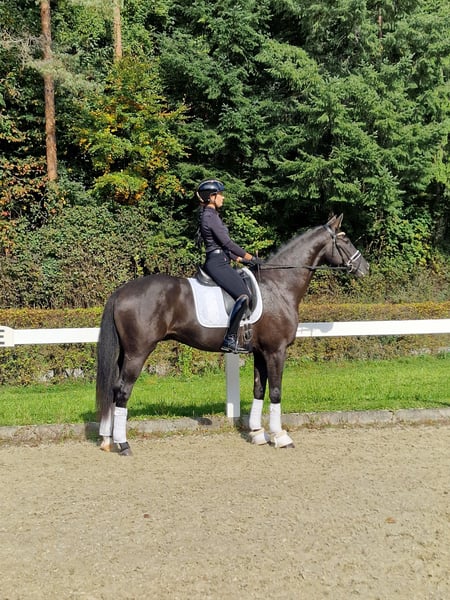Elegant Hanoverian gelding with excellent pedigree for sale. This stunning dark bay Hanoverian gelding, born in 2022, is available. Standing at 16.1 hh, he combines impressive size with a refined appearance. He impresses with his friendly nature, quality movement, and eagerness to learn. The gelding has a fantastic character, is well-behaved in handling, quick to learn with a good work ethic, and shows potential for the big arena. Please feel free to contact me for further information or to arrange a viewing. A visit can be scheduled by appointment.
