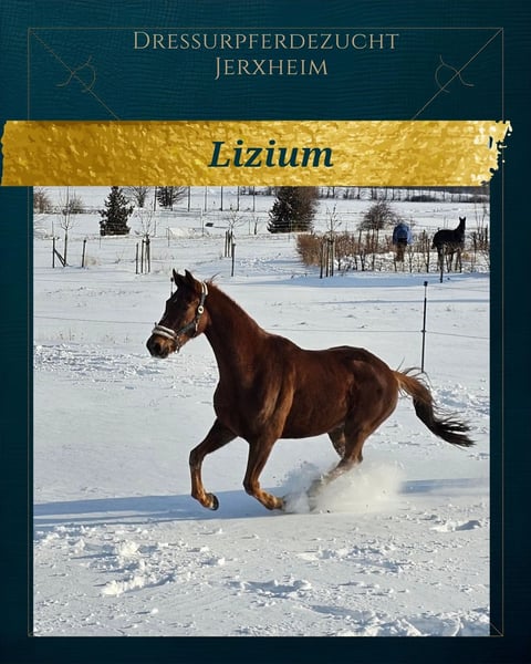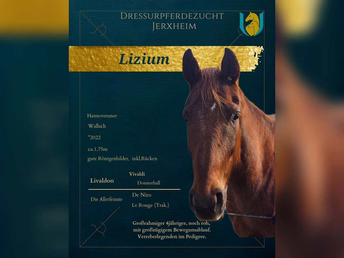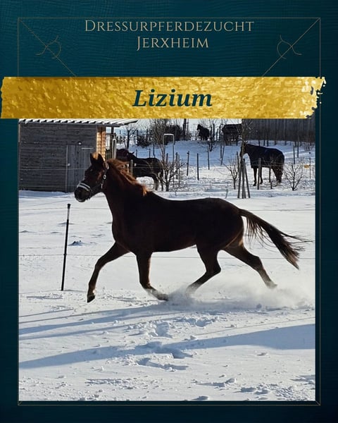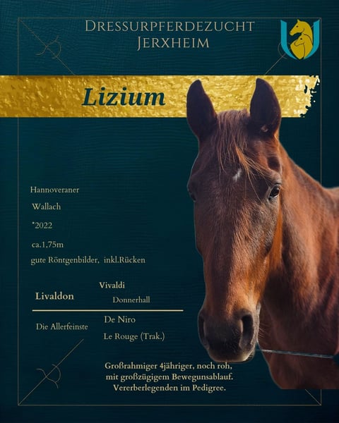 Lizium ist bei uns geboren und in der Herde aufgewachsen. Er hat drei sehr gute GGA, hervorzuheben ist der sehr gute Schritt! Der Sohn des kürzlich verstorbenen Livaldon hat ein ausgeglichenes Wesen, ist verschmust und altersbedingt verspielt. Er kennt erste Runden an der Longe. Lizium steht noch voll in der Entwicklung: die aktuelle Größe wird noch nicht sein Endmaß sein. Er steht auf korrektem, starkem Fundament und ist harmonisch gebaut. Lizium sieht einer Karriere im Dressursport entgegen und wäre aufgrund seines Charakters auch als Familienpferd geeignet. Lizium is a 4-year-old gelding born and raised with us in the herd. He has three very good basic gaits, with his excellent walk being particularly noteworthy. The son of the recently deceased Livaldon has a balanced temperament, is affectionate, and playfully spirited as expected for his age. He has completed his first sessions on the longe. Lizium is still fully developing, and his current height will not be his final one. He stands on a correct, strong foundation, is harmoniously built, healthy, and current good X-rays, including his back, are available. His sister is a Hanoverian premium candidate and will remain in our breeding program. Lizium is destined for a career in dressage and, due to his character, would also be suitable as a family horse.