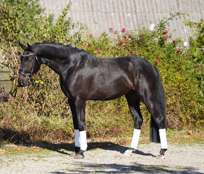 For sale is this typey grandson of For Romance, with three very good basic gaits. He was born and raised with us and has been gently backed. From day one, he proved to be uncomplicated and a pleasure to work with. Currently, he is performing reliably at solid dressage horse level (A), and continues to develop steadily. With his good basic qualities, he has excellent potential to develop into a very promising young sport horse with further training. In daily handling and within the herd, he is always friendly and easy to manage. No emails – only phone calls. Price plus VAT. All information is provided without guarantee.