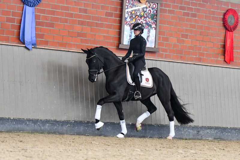 Attraktives Erscheinungsbild im herrlichen Anstrich mit figuranten Proportionen. Charmant im Umgang mit feinem Wesen und verlässlicher Einstellung. Ganz akzentuierter Ablauf mit schöner Bewegungsmechanik und leicht zu reiten. Patent, stabil und furchtlos mit exquisiter Abstammungskombination. Reitpferdeprüfung gewonnen und platziert, Dressurpferde A aktuell hoch platziert.