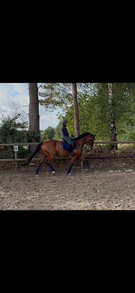 5-year-old gelding by Fusionist x Lauries Crusador This great 5-year-old gelding is looking for a new home. He is approximately 1.76m tall and is currently at a solid A-level. L-level exercises have already been playfully integrated into his training. "Fussel" wants to continue to be developed, which is why I can well imagine him with an ambitious recreational rider. He is very clear-headed and fearless, as he has already demonstrated at competitions. I am only parting with him due to a lack of time. He is farrier-friendly and loadable, as well as regularly dewormed and vaccinated. We charge €30 for a trial ride, which will of course be deducted from the purchase price. Video available upon request.