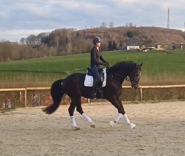 V: Daramis (De Niro), MV: Royaldik !!! Für Damen Ü50 geeignet !!! Sehr braves, wunderschönes Dressurpferd, Allrounder, Wallach 4 Jahre, springt brav Parcours mit Wasser. Absolutes Herzenspferd <3 Dieser dunkelbraune, hübsche Wallach ist ganz einfach zu Reiten, butterweich im Trab und Galopp zu sitzen, geht immer schön am Zügel und ist sehr brav dabei. Er lässt einen immer sehr gut aussehen. Er spring auch Parcours und geht überall drüber. Im Gelände geht er brav vorne und hinten in allen Gangarten. Trittsicher und unerschrocken. Er ist für jeden geeignet: Juniorenpferd/Umsteigerpferd, groß genug für Männer, aber am allerbesten stelle ich mir den bei einer Dame (Ü50) vor, die ein braves, hübches und wunderschön zu reitendes Pferd sucht. Bei uns wird er auch von Damen Ü50 geritten und nicht nur für die ist er ein totales Traumpferd. Sein Charakter ist aus Gold! Absolut ehrlich, witzig, freundlich, anhänglich ... unbeschreiblich toll dieses Pferd. Mit seinen Artgenossen ist er gut verträglich. Er ist noch verspielt. Bei mir steht er mit 3 anderen Wallachen zusammen. Schmiedefrom, Verladefrom. Verkauf im Auftrag. Kontakt Frau Jana: 0170 - 9 333 000