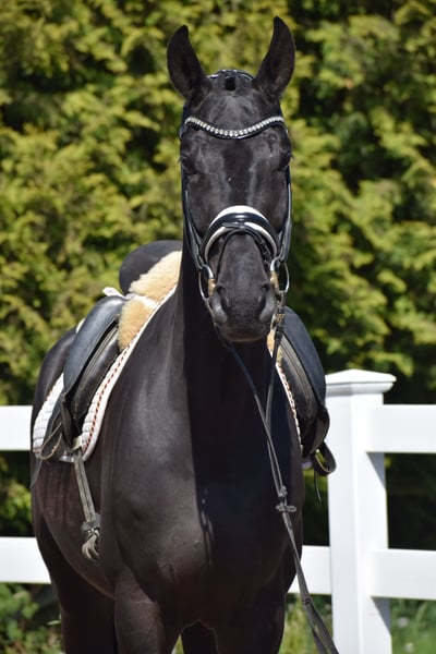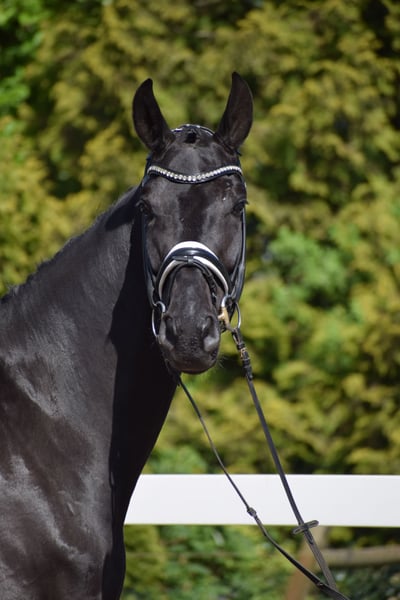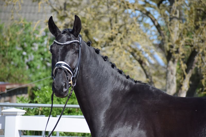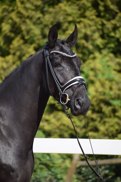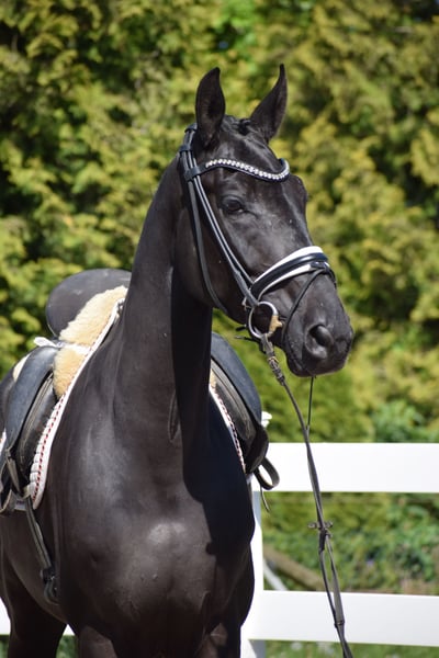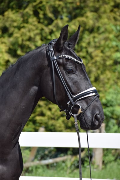 BEEINDRUCKEND SCHÖNER, RAPPSCHWARZER, LERNWILLIGER, LEICHTRITTIGER, INTELLIGENTER BEWEGUNGSKÜNSTLER FÜRS GROßE VIERECK - Junioren geeignet! Zum Verkauf steht in Vertretung des Besitzers, dieser beeindruckend schöne, 171 cm große, 6-jährige Hannoveraner Rapp Wallach mit bester Dressurabstammung von DOHNANYI x RASCALINO x WARKANT. "DON" weiß schon optisch zu Überzeugen. Mit lackschwarzer Jacke, hinten zwei mal Weiß, typvollem Gesicht, imposanter Erscheinung und einem harmonischen Gebäude zieht er gleich alle Blicke auf sich. In der Bewegung zeigt sich "DON" als Sportler fürs große Viereck. Mit viel Schwung und Schub ausgestattet, bewegt er sich ausgesprochen Taktvoll mit großzügigen Abläufen. Zudem verfügt er über ein sehr gutes Hinterbein, mit viel Kraft, Lastaufnahme, weit unter den Schwerpunkt fußen und sehr gut gewinkelt. Hieraus erwächst Raumgriff, Schulterfreiheit, Schub, Abdruck und Bergauftendenz. "DON" ist Rittig und gefällig in der Anlehnung. Er möchte gefallen und die reiterlichen Hilfen annehmen und umsetzen, daher ist "DON" auch für JUNIOREN mit jungpferde Erfahrung geeignet. Alles in allem zeigt sich hier ein heranwachsendes S Dressur Nachwuchspferd mit guten Ansätzen für den Grand Prix Sport mit herausragendem Schritt! "DON" wurde schonend ende 4j. angeritten und befindet sich seid her im professionellem Beritt und ist sicher auf Dressurpferde A Niveau gefördert und Dressurpferde L Niveau angefangen. Seine Einstellung und sein Ehrgeiz machen aus Ihm einen kooperativen Leistungssportler mit der richtigen Einstellung zum Sport. Gerne kann "DON" nach dem Kauf, bei uns in professionellem Beritt verbleiben. Ein umfangreicher röntgologischer Tüv 18 Bilder + Rücken, sowie ein aktueller klinischer Tüv liegt vor und seiner sportlichen Karriere steht nichts im Wege.