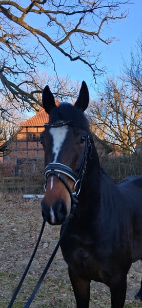 Hannoverian Gelding – Promising Dressage Partner This elegant Hannoverian gelding was foaled in 2020 and impresses with his striking appearance and promising talent in dressage. Standing at 173 cm (16.1 hh), he offers the perfect size for ambitious riders seeking a reliable and well-trained partner. His dark bay coat gives him an noble presence, complemented by his harmonious conformation and attentive demeanor. The gelding is already well-schooled and demonstrates a solid foundation in dressage. His movements are rhythmical, elastic, and expressive, making him an ideal candidate for higher-level competition. He is friendly in handling, alert, and always motivated to learn new things. Thanks to his solid training and pleasant character, he is suitable for advanced riders as well as ambitious young talents. A horse with great potential, looking for a dedicated rider to further develop his skills. We look forward to hearing from you if you're interested, so we can discuss further details and provide a personal impression.