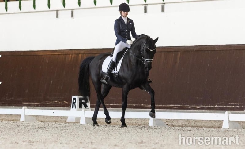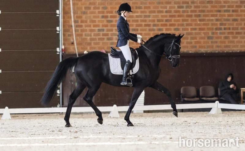 A rare find from Europe – ideal for an ambitious amateur or developing professional Height: 167 cm Color: Black Bloodlines: • Sire: Finest • Dam: Stella Why he stands out: This Hanoverian gelding offers tomorrow’s potential today. He combines: • Three expressive, clean gaits • Natural contact and attention to the rider • Trainability and mental stability Currently working at Class P level, already showing in competition: 73% in Class L at regional shows — young but already proving himself in the ring. A true rising star who will grow with his rider. Character and behavior: • Intelligent, brave, and not spooky — calm in new environments • Used to dogs, stabling, and transport • Polite for the farrier, responsive in groundwork • Balanced energy — sensitive and focused without tension Everything available to view and try if you can travel to the yard. Potential buyers need to WhatsApp us a video of their riding ability through to - Click here to reveal phone number - and we can assess suitability. Worldwide shipping available please contact us for a quote.