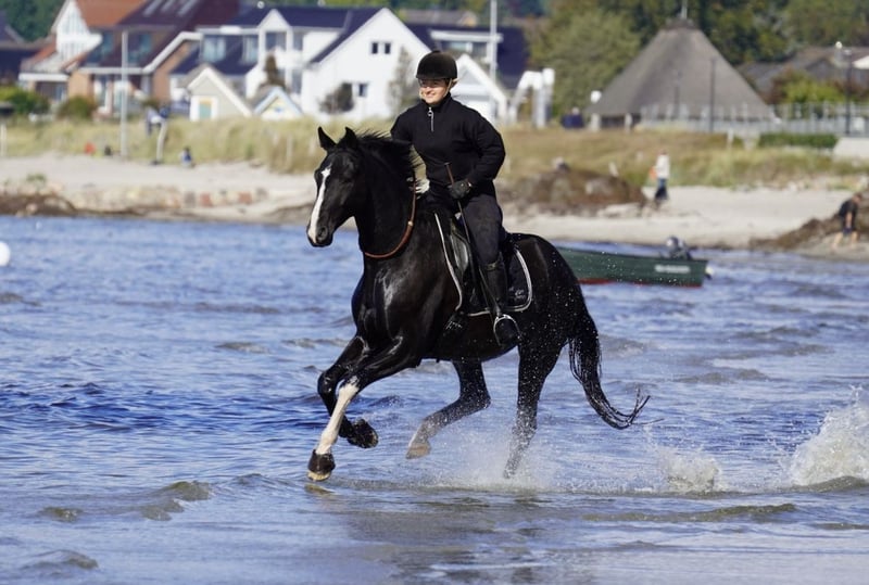 Escaniro, born and raised with me, has been a little charmer from the very beginning. He is easy to handle for children, trains very easily, has a huge heart, and an incredible amount of trust in humans. He can do all sorts of things, but has always been ridden gently and has also had plenty of breaks in the pasture. He is 4 years old and placed in DRP-A; since I am not a competitive rider, he has only been to a show twice, which he handled excellently, even though he had just been backed. He has been with me at fairs, shows, the beach, etc. He is well-versed in outings. He is not only at home in dressage but can also do free work, riding with a neck ring, various circus lessons, follows you around the yard, goes out with children, and is familiar with traffic, tractors, and more. He jumps a small course without any problems and has already been to the cross-country course, where he overcame all obstacles without batting an eye. He truly leaves nothing to be desired and is incredibly calm and relaxed for his age. Nevertheless, he is not lazy when ridden and has a very pleasant temperament. He does not know any bad habits like bucking or rearing. He was raised robustly in a paddock and is familiar with herd living with other geldings. Even currently, and for his entire life, he has been outside summer and winter. He has already had X-rays taken with no findings, including of the back. I wish for an absolutely dream home for him. He is a very special horse to me, but unfortunately, I cannot keep them all. I am a master in equine management specializing in riding; if you are interested in my work, check out -> hello_horses_official_ on Instagram.