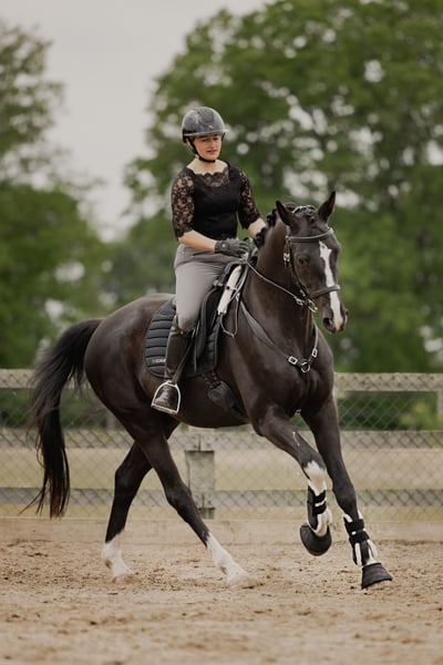 Escaniro, bij mij geboren en opgegroeid, was vanaf het begin een kleine charmeur. Hij is door kinderen te hanteren, laat zich heel gemakkelijk opleiden, heeft een enorm groot hart en ongelooflijk veel vertrouwen in mensen. Hij kan van alles, maar is toch altijd voorzichtig bereden en heeft ook regelmatig pauze op de wei mogen nemen. Hij is 4 jaar oud en DRP-A geplaatst. Aangezien ik geen wedstrijdruiter ben, is hij slechts twee keer op een wedstrijd geweest, wat hij, net als alles andere, geweldig heeft gedaan, hoewel hij net onder het zadel was. Hij is met mij naar beurzen, shows, naar het strand, enz. geweest. Uitstapjes kent hij genoeg. Hij is niet alleen thuis in de dressuur, maar kan ook vrijheidswerk, halsringrijden, verschillende circuslessen, hij volgt je op de boerderij, gaat ook met kinderen het terrein op, kent het verkeer, tractors en meer. Een klein parcours springt hij probleemloos, zelfs op de crossbaan is hij al geweest, waar hij ook alle hindernissen zonder te aarzelen heeft overwonnen. Hij laat werkelijk geen wensen onvervuld en is voor zijn leeftijd ongelooflijk rustig en ontspannen. Toch is hij tijdens het rijden niet lui, maar heeft hij ook hier een zeer aangenaam temperament. Bokken, steigeren of andere ongewenste gedragingen kent hij absoluut niet. Hij is robuust opgegroeid in een buitenstal en kent groepshuisvesting met andere hengsten. Ook momenteel en zijn hele leven staat hij zomer en winter buiten. Hij heeft al röntgenfoto's zonder bevindingen, inclusief van de rug. Ik wens hem een absoluut droomhuis. Hij is een heel bijzonder paard voor mij, maar ik kan ze helaas niet allemaal houden. Ik ben paardenhouderijmeester SP Rijden. Als u geïnteresseerd bent in mijn werk -> hello_horses_official_ op Instagram.