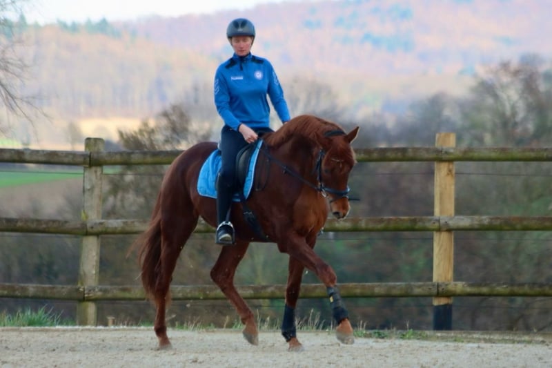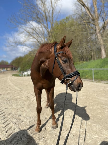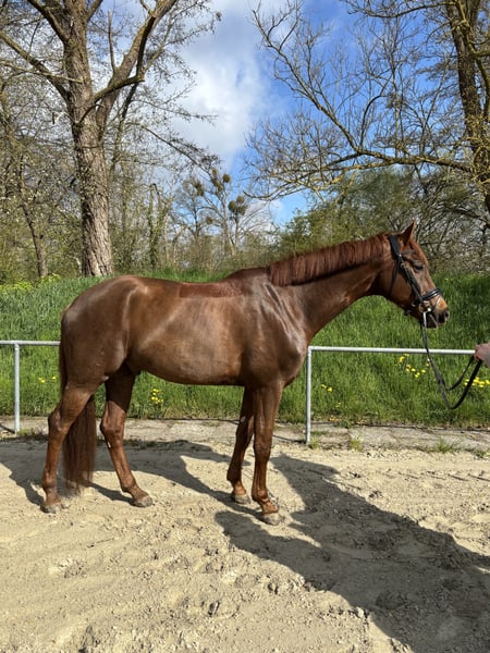 We are offering our 7-year-old dark chestnut gelding for sale. The gelding impresses with above-average gaits and an outstanding temperament – an absolute reliable partner! He is herd-friendly and healthy; a 2022 veterinary check-up with no findings is available. The gelding has achieved wins and placings in A-Dressage and is currently ready for L-level competitions! He is a bit of a kicker and is therefore being sold well below value. A fee of €40 is charged for a trial ride, which will be deducted from the purchase price if the horse is bought.