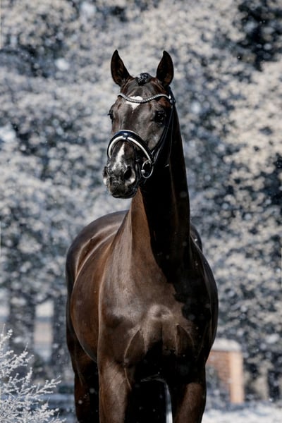 Jet black sport horse that leaves nothing to be desired! Elegant, agile mare with optimal markings and a successful sporting career. A pleasing and tasteful movement talent with natural rideability and a high-quality basic build. Powerful in the frame with quick hindleg action, well-connected behind, and natural impulsion — combined with maximum self-carriage, a clear mind, and unwavering ambition. These desirable traits highlight the potential career of this already highly decorated athlete, who has achieved top placements up to the S-level dressage classes. GP-level movements are already quite well established at training level. An eye-catching young horse with magnetic presence, offering limitless potential in the right hands. Direct from the breeder, with an impeccable pedigree and a clean health certificate.