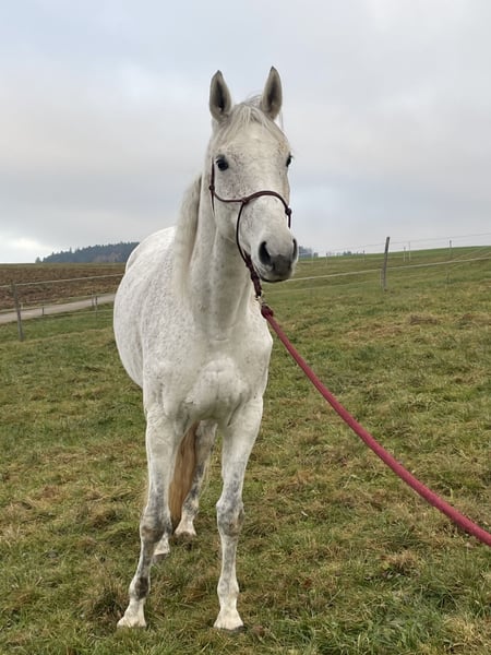 Verkaufe elegante Stute mit Top Springpapier – aus der Shutterfly-Linie! Fliegenschimmel, Geburtsjahr 2016 Diese wunderschöne Stute besticht durch ihre ansprechende Erscheinung und ihre hervorragende Abstammung. Geboren im Jahr 2016, ist sie eine vielversprechende Zuchtstute mit viel Potenzial. Mit einem Stockmaß von 165 cm vereint sie Eleganz und Stärke. Sie hatte 2022 ein Fohlen und wurde im Anschluss nicht wieder auftrainiert. Aktuell hat sie hinten lockere Bänder und wird daher als Zuchtstute abgegeben. Ideal für Zuchtinteressierte die Wert auf Qualität legen. Die Abstammung ist in den Bildern ersichtlich. Bei Interesse oder weiteren Fragen stehe ich Ihnen gerne zur Verfügung.