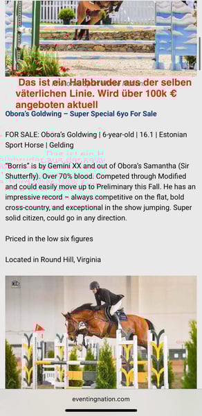 Sprzedam elegancką klacz z doskonałym rodowodem skokowym – z linii Shutterfly! Gniada, urodzona w 2016 roku Ta przepiękna klacz zachwyca swoją atrakcyjną prezencją oraz znakomitym pochodzeniem. Urodzona w 2016 roku, jest obiecującą klaczą hodowlaną z dużym potencjałem. Przy wzroście 165 cm łączy elegancję z siłą. W 2022 roku miała źrebaka, po czym nie była ponownie trenowana. Obecnie ma luźne więzadła z tyłu, dlatego jest oferowana jako klacz hodowlana. Idealna dla hodowców ceniących wysoką jakość. Rodowód jest widoczny na zdjęciach. W przypadku zainteresowania lub dodatkowych pytań, chętnie służę pomocą.