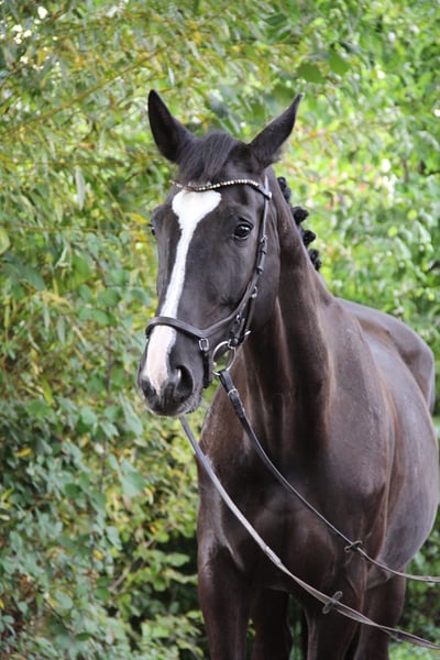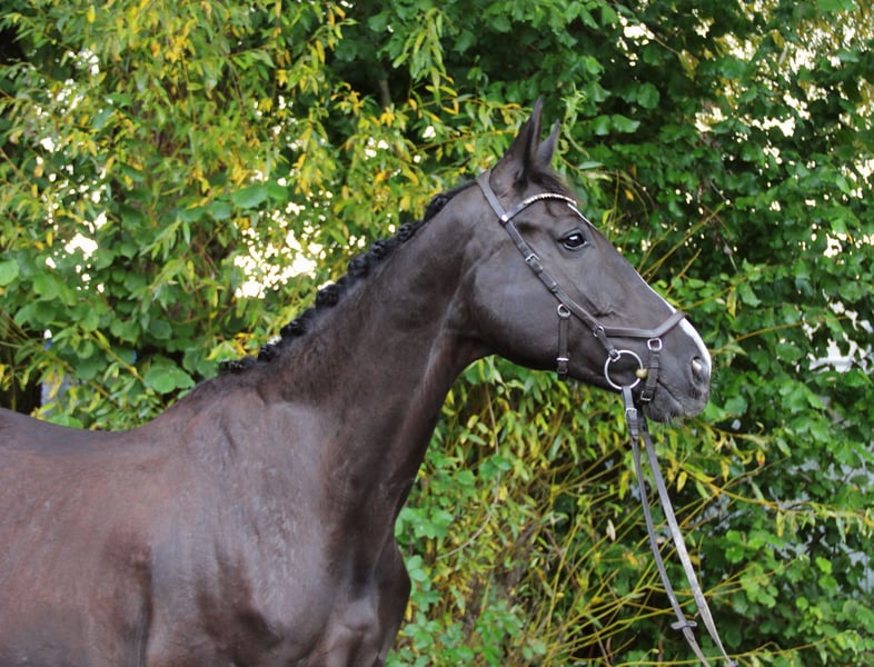 This jet-black beauty with four white legs and a distinctive blaze is not only a visual stunner – her presence attracts all eyes. However, her true strength lies in her calm, clear nature: She impresses with her reliability, her composure in every situation, and her open, fearless demeanor – even in unfamiliar surroundings, she always presents herself confidently and quickly finds her way. The 10-year-old mare (approximately 1.75 m) shows light contact under saddle, is fine to ride, and impresses with her exceptional swing, clear uphill tendency, and three expressive basic gaits. In dressage, she is trained to L level and shows great potential for further development. She requires correct riding and desires an experienced rider who can further promote her potential and work with her sensitively. She also happily takes on poles or small jumps, although she has not been specifically trained in this area so far. Her true talent clearly lies in dressage, where she excites with her expressiveness, rideability, and potential. On paper, she has everything: With her pedigree of Rotspon x Der Lord, she combines performance and rideability in an impressive way – a lineage that speaks for itself and underscores her quality. For this reason, she is also interesting for breeding. Whether in the arena, on the trails, or simply in daily handling – this mare brings joy. She is fearless, good for the farrier and loading, and presents herself as a true all-rounder who impresses daily with her positive work ethic. Due to changes in our personal circumstances, we are looking for a loving and suitable home for Roxy. For serious inquiries, we are happy to send videos of her being ridden as well as from her daily life. A trial ride is possible by arrangement (cost contribution of €20).