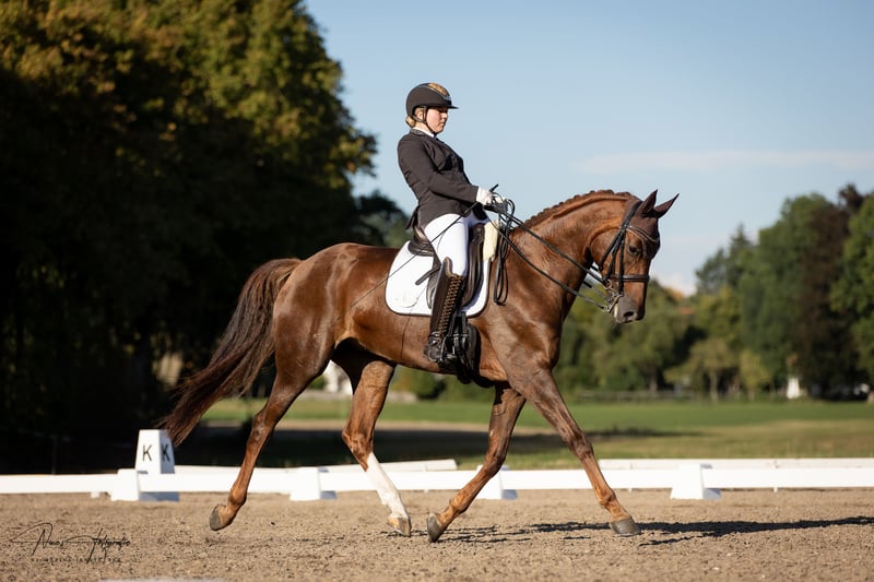 ⚜️Sweety⚜️ Hanoverian mare Sarotti-Mokka-Sahne x Brentano II Age: 9 years (2016) Height: approximately 1.75 m (17.1 hh) Training level: placed up to M dressage Temperament: well-behaved, affectionate, uncomplicated Other: a true treasure Due to personal health reasons, I am selling my elegant chestnut mare. She impresses with her impeccable character. In handling, she is absolutely well-behaved and fearless. Whether at competitions or in unfamiliar environments, she always stays focused and calm. Under saddle, she has the necessary go and energy that a dressage horse should have. A fantastic sport partner to start riding and enjoy. Overall, a horse that brings joy every day. Placed in M at amateur level in 2025. Registered in the main studbook of the Hanoverian Verband. Passed the mare licensing examination.