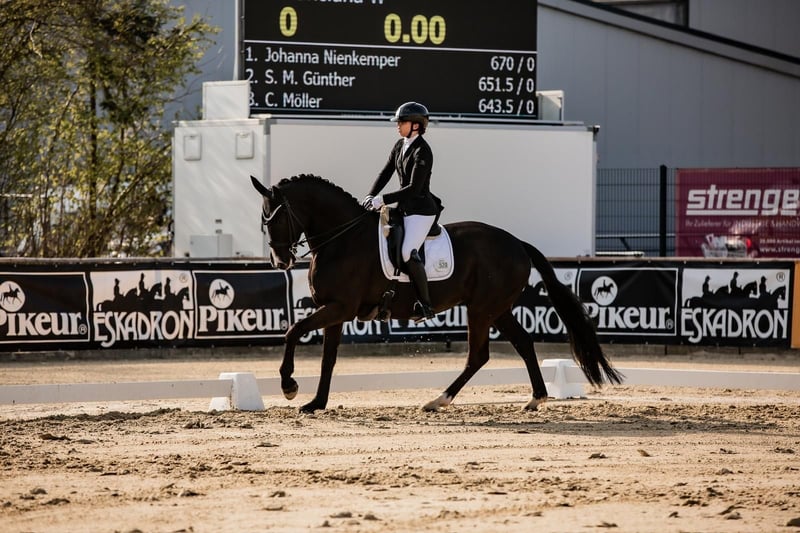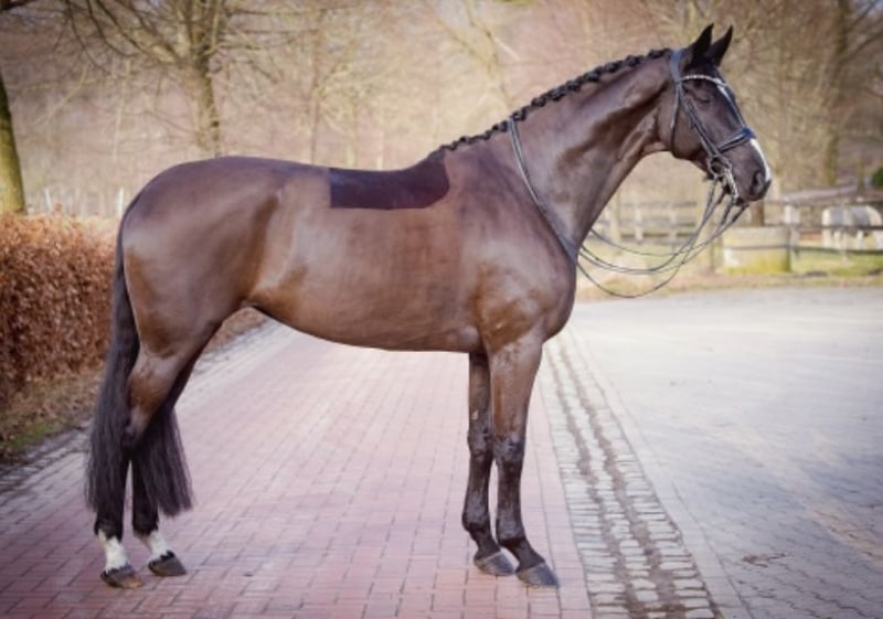 Elegant Hanoverian Mare – Promising Dressage Partner We are pleased to offer an impressive Hanoverian mare for sale. Born in 2014, this elegant dark bay mare with a height of 17.5 hh presents herself as an ideal partner for ambitious dressage riders. The mare impresses with her expressive appearance and finely tuned movement mechanics. Multiple M-level wins and S-level placements. Very well-behaved, motivated, and cooperative, making her suitable for junior riders as well. Sold only due to time constraints (studies). For more information or to arrange a personal viewing, we look forward to hearing from you. Video available upon request. The horse is located in Hövelhof, 33161.