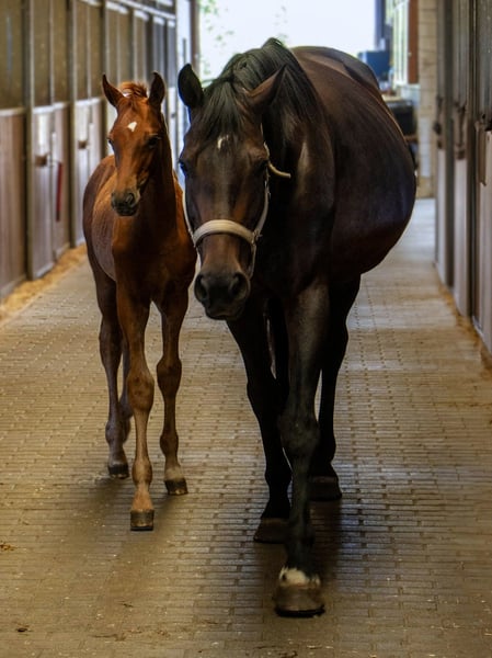 Beautiful dark chestnut mare with a friendly character and a great love for trail riding. She is the ideal leisure horse and enjoys all kinds of activities. However, she shows less motivation during dressage work within the arena. The mare has been gently used in breeding and has already given birth to two valuable, dressage-oriented foals. She is unspoiled and will easily regain her training with light work. Thanks to her sought-after pedigree, good basic gaits, and wonderful temperament, she is also highly suitable as a riding broodmare with the option to raise a foal. With an approximate height of 17.8 hands, she suits riders with some experience or those who wish to be guided during training. She is also excellent for junior riders and makes a fantastic family horse. In daily handling, she is very people-oriented and always well-behaved. She requires some assistance with loading, such as good horsemanship or a calm environment. This mare is a real gem and touches every heart! 🐎 A very good X-ray report is available. She is healthy, vaccinated, and in ideal condition regarding feeding and care. We would be happy to show you this wonderful leisure partner in person and are available for any questions at any time! Feel free to contact us via WhatsApp: +49 176 55323449.