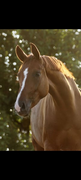 We are looking for a new home for our 13-year-old, approximately 16.1 hh dark chestnut mare, Qwen. Due to a diagnosis of osteoarthritis in her right carpal joint, she is being sold well below market value. She is currently not in training. Further details gladly provided upon request. She is trained up to medium level in dressage. This year, she placed in class L and was successful in class A. She can be ridden alone or in a group in the terrain. Her uncomplicated and willing nature makes daily work a joy, constantly inspiring confidence. In handling, she is a real sweetheart. Currently, she is kept with a gelding but also gets along well with mares. We wish for a home with regular turnout and plenty of movement. She is farrier and loading friendly. Currently barefoot but also knows shoes. We can see Qwen as a family or leisure horse, or as a broodmare. Breeding papers are available. She has foaled once in the past. Serious inquiries are welcome.