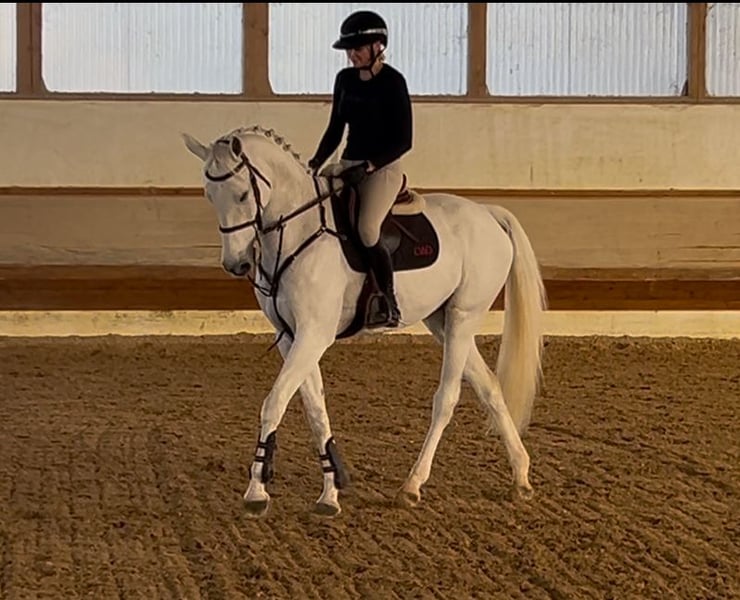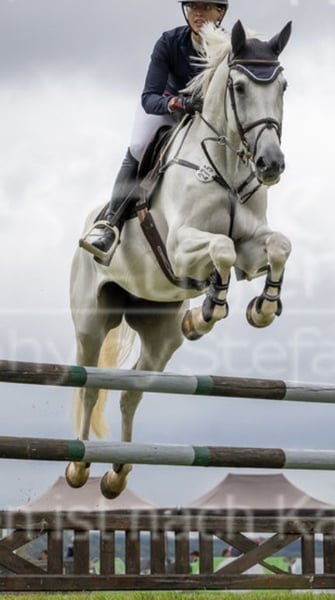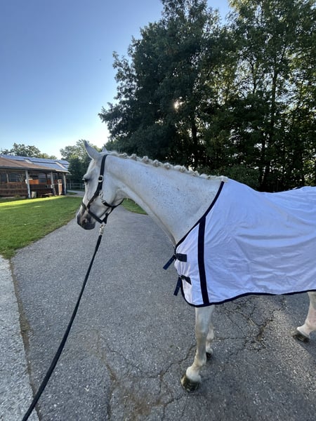 For sale is a beautiful 13-year-old gray mare, who impresses not only with her lovely appearance but especially with her absolutely lovable and reliable character. She is very well-behaved, relaxed, and easy to ride, making her truly suitable for everyone – both for ambitious amateurs and for a child making the transition from pony to a large horse. My 8-year-old son even rides her without a saddle, and recently a beginner child completed their very first jump with her (see video) – she handles both with calmness and reliability. Athletically, she has everything to offer: she has placed in M-level show jumping, won L-level show jumping, and has multiple placements, making her the ideal amateur and family horse. At competitions, she always presents herself well-behaved and proper – she has no issues with other horses in the warm-up area. In everyday life, she is an absolute treasure: she is trail-safe, goes out alone and with other horses, is easy to load (trailer and truck), is shoe-friendly (four shoes), and is also completely uncomplicated when it comes to clipping. She is familiar with the walker, loves the pasture, and gets along well with other horses in the field. Health-wise, she is in top shape: she has a complete competition history, has never been lame (according to the previous owner), is very robust, her teeth have just been done, and her vaccination status is up to date. She has always been healthy and sound with both me and the previous owner. No history of heaves. No bad habits. A current vet check is not available. Due to her good lineage, the mare could also later be ideally suited as a breeding mare. We are only parting with her because I am giving up competitive riding. It is important to us that she goes to a nice, loving new home where her wonderful character, versatility, and big heart will be appreciated. Please contact us exclusively via mobile, preferably by phone ;-) The horse is located in 97215 Simmershofen.