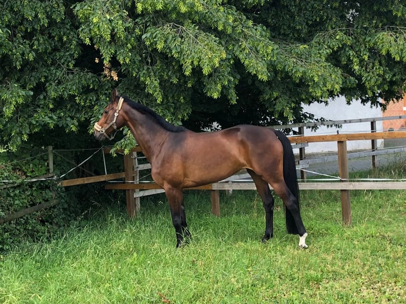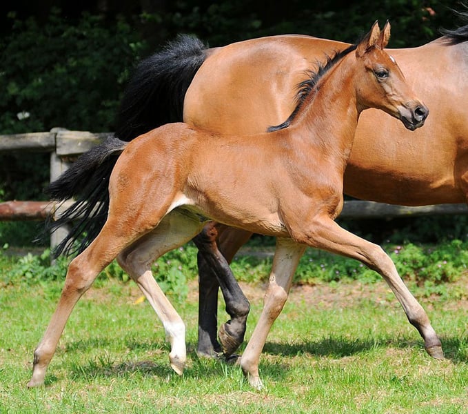 Beautiful 14-year-old mare from the Alferatestamm for sale. Half-sister Livaldi is the dam of stallion Bon Vivaldi NRW, who has recently produced 2 vice-champions at the Bundeschampionat. Half-sister Fräulein Florence is successful up to Inter1. The mare has been taken out of sport due to a suspensory ligament injury and is now in breeding. The photos show the mare as a foal, in young horse competitions, and with a foal by Bon Bolero at foot (also for sale). She is again in foal by Bon Bolero. Quality before price. If you have any questions, please call us! 0172 - 44 15 444 (Hermann Kleemeyer)