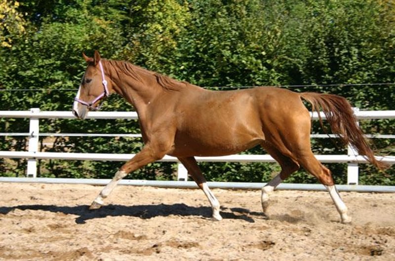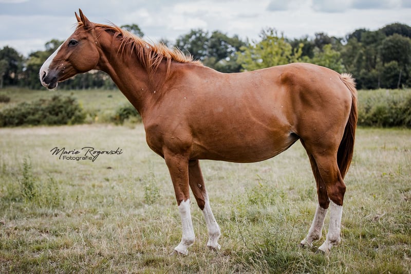 Diva 585 è una delle poche figlie dirette di DANCIER (De Niro - Lancier) e questo fatto parla da solo. Dalla parte della madre, World Cup - Grande, il pedigree non lascia nulla a desiderare. Abbiamo rilevato la cavalla nel 2015 da un cliente (inaffidabile) che l'aveva presa da un maneggio. La cavalla è stata mostrata con successo da un cavaliere amatoriale in giovane età fino al livello avanzato di dressage (lista di registrazione FN I per i cavalli da equitazione tedeschi 2014) e aveva già un puledro. Nel nostro programma di allevamento di cavalli sportivi geneticamente più brillanti, ha prodotto altri tre splendidi puledri nel 2018 (palomino <170 cm, Oldenburg), 2020, 2022 (vedi galleria fotografica) con diversi accoppiamenti per riproduzione naturale. È una madre senza problemi. I puledri sono sempre molto apprezzati. Può essere allevata con uno dei nostri numerosi stalloni alleggeriti. Diva è un castano con la variante genetica aggiuntiva "macchie dell'uccello". Scheda DNA disponibile. 2014 registrata nel Libro genealogico I del Libro genealogico della Westfalia. 2019 ulteriore registrazione libro genealogico I dell'Oldenburg Verband. Riconosciuto anche da Zangersheide nel 2020. 2021 Registrazione IFCE e riconoscimento come fattrice in Francia (Stud-book de reproduction : FACTEUR DE SELLE FRANCAIS). La nostra mandria da riproduzione vive all'aperto tutto l'anno su pascoli molto estesi. Diva è l'attuale fattrice guida di quasi 40 fattrici di età compresa tra 1 e 24 anni, con una fidanzata fissa. Ha sempre affrontato diversi viaggi in autocarro su lunghe distanze senza problemi. La diamo via in movimento permanente. Può essere cavalcata di nuovo con un'attenta cura professionale degli zoccoli e dovrebbe rimanere a pelo. È possibile sottoporla a regolare taglio degli zoccoli, sverminazione, vaccinazione - aggiornata su richiesta - nonché a trattamenti odontoiatrici e osteopatici. Vendita privata dopo incontro personale. L'alloggio è fornito gratuitamente. Il prezzo... simbolico di un euro NON è il prezzo di vendita. Il prezzo di vendita dipende dall'acquirente e da altri accordi contrattuali. In questo caso l'acquirente può segnare dei punti a suo favore (o, in ultima analisi, a favore del cavallo) grazie a un buon allevamento e/o a un posto in cui vivere (non c'è passaggio di proprietà). Tutti gli animali sono disponibili solo su presentazione personale.
