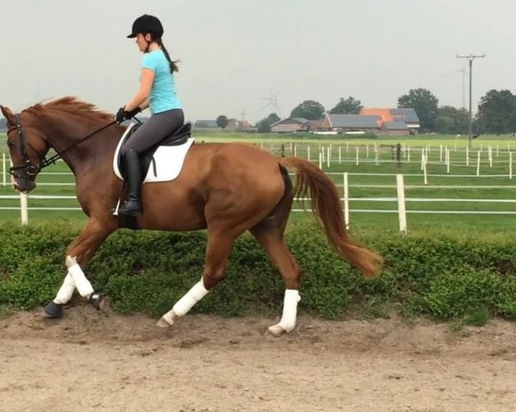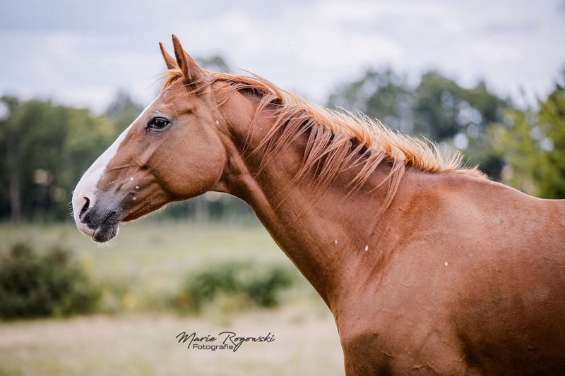 Diva 585 jest jedną z nielicznych córek DANCIER (De Niro - Lancier), co mówi samo za siebie. Po stronie matki, po World Cup - Grande, rodowód nie pozostawia nic do życzenia. Klacz przejęliśmy w 2015 roku od (nierzetelnego) klienta, który nabył ją od stajni jeździeckiej. Klacz była z powodzeniem pokazywana przez jeźdźców amatorów aż do zaawansowanego poziomu ujeżdżenia w młodym wieku (lista rejestracyjna FN I dla niemieckich koni jeździeckich 2014) i miała już tam ogierka. W naszym programie hodowlanym genetycznie rozjaśnionych koni sportowych, urodziła jeszcze trzy wspaniałe ogierki w 2018 (palomino <170cm, Oldenburg), 2020, 2022 (patrz galeria zdjęć) z różnych kojarzeń przez naturalną hodowlę. Jest bezproblemową matką. Źrebięta są zawsze bardzo popularne. Może być kryta jednym z wielu naszych ogierów. Diva jest kasztanem z dodatkowym wariantem genetycznym "birdcatcher spots". Karta DNA dostępna. 2014 zarejestrowana w Księdze Stadnej I Westfalskiej Księgi Stadnej. 2019 dalsza rejestracja w księdze stadnej I Związku Oldenburgów. Uznany również przez Zangersheide w 2020 roku. 2021 IFCE zarejestrowana i uznana jako klacz hodowlana we Francji (Stud-book de reproduction: FACTEUR DE SELLE FRANCAIS). Nasze stado hodowlane żyje na zewnątrz przez cały rok na bardzo rozległych użytkach zielonych. Diva jest obecnie główną klaczą odpowiedzialną za prawie 40 klaczy w wieku od 1 do 24 lat, ze stałą dziewczyną. Zawsze bez problemów ukończyła kilka długodystansowych podróży ciężarówką. Oddajemy ją do stałego ruchu. Przy starannej, profesjonalnej pielęgnacji kopyt może być ponownie użytkowana. Możliwe regularne przycinanie kopyt, odrobaczanie, szczepienia - aktualizowane na życzenie - a także leczenie stomatologiczne i osteopatia. Sprzedaż prywatna po osobistym spotkaniu. Zakwaterowanie jest zapewnione bezpłatnie.