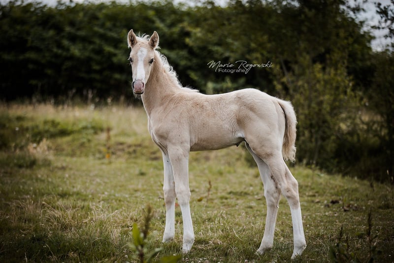 Diva 585 is one of the few remaining direct daughters of DANCIER (De Niro - Lancier) – that alone speaks for itself. On her dam's side, she is by World Cup - Grande, leaving nothing to be desired in terms of pedigree. We took over the mare in 2015 from an (unreliable) customer who had taken her from a riding stable. The mare was successfully presented by an amateur up to A-level dressage at a young age (FN registration list I for German riding horses 2014) and already had a colt there. In our breeding programme for genetically lightened sport horses, she produced three more wonderful colts in 2018 (palomino <170 cm, Oldenburg), 2020 and 2022 (see picture gallery) with different pairings in natural mating. She is an easy-going mother. The foals are always very popular. Registered in 2014 in Stud Book I of the Westphalian Stud Book. Further registration in 2019 in Stud Book I of the Oldenburg Association. Also recognised by Zangersheide in 2020. Registered with the IFCE in 2021 and recognised as a broodmare in France (Stud-book de reproduction: FACTEUR DE SELLE FRANCAIS). Our breeding herd lives outdoors all year round on very spacious grassland. Diva is the current lead mare, confidently ruling over almost 40 mares between 1 and 24 years of age, with one close friend. She has completed several long-distance transports by lorry without any problems.