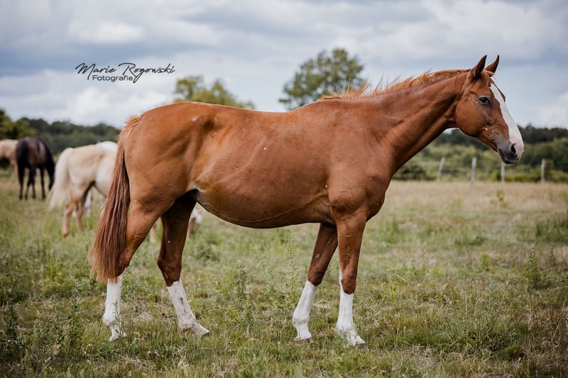 Diva 585 is een van de weinige laatste rechtstreekse DANCIER (De Niro - Lancier) dochters - dat alleen al spreekt voor zich. Aan moederszijde door World Cup - Grande laat de afstamming niets te wensen over. We namen de merrie in 2015 over van een (onbetrouwbare) klant die haar van een manege kreeg. De merrie is al op jonge leeftijd succesvol uitgebracht door amateurruiters tot op gevorderd niveau dressuur (FN registratielijst I voor Duitse rijpaarden 2014) en heeft daar al een veulen gehad. In ons fokprogramma van genetisch opgefokte sportpaarden heeft ze in 2018 (palomino <170cm, Oldenburg), 2020, 2022 (zie fotogalerij) nog drie prachtige hengstveulens voortgebracht met verschillende dekkingen via natuurlijke dekking. Ze is een probleemloze moeder. De veulens zijn altijd erg populair. Ze kan gefokt worden met een van onze vele lichtgetinte hengsten. Diva is een vos met de extra genetische variant "birdcatcher spots". DNA-kaart beschikbaar. 2014 ingeschreven in stamboek I van het Westfaalse stamboek. 2019 verdere registratie stamboek I van het Oldenburger Verband. In 2020 ook erkend door Zangersheide. 2021 IFCE geregistreerd en erkend als fokmerrie in Frankrijk (Stud-book de reproduction : FACTEUR DE SELLE FRANCAIS). Onze fokkudde leeft het hele jaar door buiten op zeer extensief grasland. Diva is de huidige leidmerrie van bijna 40 merries tussen de 1 en 24 jaar oud, met een vaste vriendin. Ze heeft altijd meerdere langeafstandsritten met vrachtwagens zonder problemen volbracht. We geven haar weg in permanente beweging. Ze kan ook opnieuw bereden worden met zorgvuldige, professionele hoefverzorging en ze moet blootsvoets blijven. Regelmatig hoefbekappen, ontwormd, gevaccineerd - bijgewerkt op aanvraag - evenals tandheelkundige behandeling en osteopathie mogelijk. Privéverkoop na persoonlijk gesprek. Accommodatie is gratis beschikbaar. De prijs ... het symbolische bedrag van één euro is NIET de verkoopprijs. De verkoopprijs is afhankelijk van de koper en andere contractuele afspraken. Hier kan de koper punten scoren in zijn (of uiteindelijk het paard) voordeel door goede verzorging en/of een plek om te wonen (geen doorgeefluik). Alle dieren zijn alleen beschikbaar op persoonlijke presentatie.