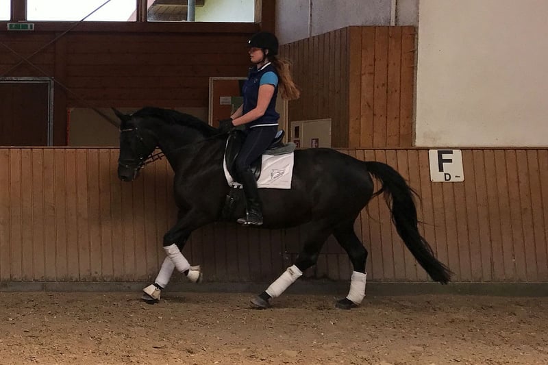 Visítenos y conozca a Ruby Dawn - ¡la perla negra de nivel avanzado (S)! Esta yegua fácil de montar, con tres aires básicos muy buenos y una alzada de 1,66 metros, está ahora entrenada hasta el nivel avanzado de doma clásica y tiene todo lo que el corazón de un jinete desea. Desgraciadamente, suele estar muy tensa en los concursos, por lo que no la hemos mostrado mucho, pero hace poco quedó segunda en una prueba de doma de nivel medio**. Ya sea para el jinete precavido al que le gustaría dar clases exigentes o para el jinete de ocio exigente en campo a través, Ruby Dawn es la compañera perfecta. Al manejarla y montarla, siempre tiene las ideas claras, es digna de confianza y fácil de manejar. También es fácil de forjar y cargar. Déjese convencer por el talento y el carácter de Ruby Dawn. Ruby Dawn está deseando encontrar un nuevo hogar donde seguir recibiendo apoyo y cariño.