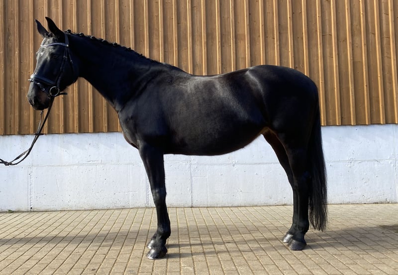 Visit us and get to know Ruby Dawn - the black advanced (S) level pearl! This easy to ride mare with three very good basic gaits and a height of 1.66 m is now trained up to advanced dressage level and has everything a rider's heart desires. Unfortunately, she was usually very tense at competitions, which is why we didn't show her much, but she recently placed second in a medium (M) level dressage test**. Whether for the cautious rider who would like to ride challenging lessons or the demanding leisure rider in cross-country - Ruby Dawn is the perfect partner. When handling and riding, she is always clear-minded, trustworthy and easy to handle. She is also easy to forge and load. Let Ruby Dawn's talent and character convince you. Ruby Dawn is looking forward to a new home where she will continue to be supported and loved.