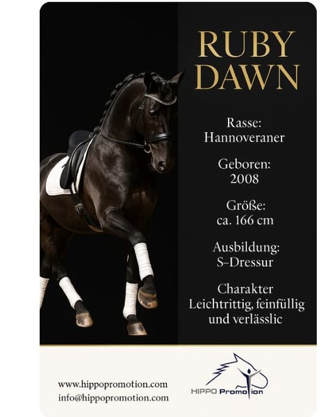 Besök oss och lär känna Ruby Dawn - den svarta pärlan på S-nivå! Detta lättridna sto med tre mycket bra grundgångarter och en längd på 1,66 meter är nu dressyrutbildad till S-nivå och har allt som en ryttares hjärta kan önska. Tyvärr var hon oftast väldigt spänd på utställningar, varför vi inte har visat henne så mycket, men nyligen placerade hon sig som tvåa i ett dressyrprov på medelsvår** nivå - oavsett om det gäller den försiktiga ryttaren som vill rida utmanande lektioner eller den krävande fritidsryttaren i terrängen - Ruby Dawn är den perfekta partnern. Vid hantering och ridning är hon alltid klar i sinnet, pålitlig och lätthanterlig. Hon är också lätt att smida och lasta. Låt dig övertygas av Ruby Dawns talang och karaktär. Ruby Dawn ser fram emot ett nytt hem där hon kommer att fortsätta att bli stöttad och älskad.