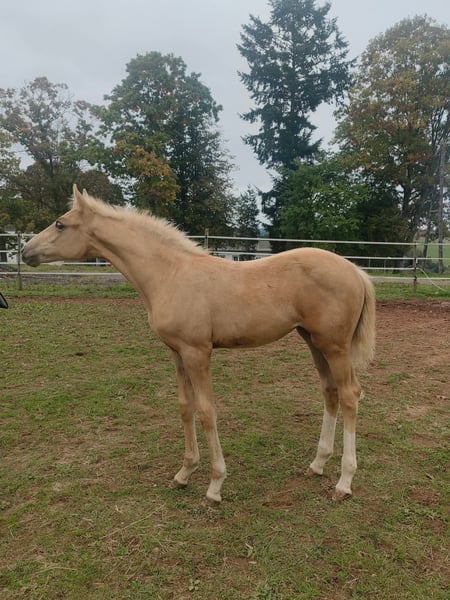 Due to unreliable buyers, she is back on the market. You learn from experience... Because of my pregnancy, I am willing to part with my young sporthorse. This is not a desperate sale! Elsa features a stunning palomino color combined with excellent genetics for show jumping and eventing. She is registered with the SCSL - Studbook du Cheval de Selle Luxembourgeois. She has top lines for jumping and eventing, with strong performance bloodlines and a solid dam line. Her sire is a young stallion from the renowned Muze stud farm. Her dam has shown free jumping in the Hanoverian main studbook, and her grandmother has achieved sport success. Elsa presents as a very correct and brave yearling, with plenty of power in the hindquarters and a harmonious conformation. She is energetic but very friendly. She stands quietly for grooming, tacking, and leading, and is easy to handle when it comes to hoof care, spraying, and touching all over. Very fearless. An ideal sport horse for an ambitious and experienced rider in eventing or show jumping. Her final height should be around 16.1 hh. She has been raised in a premium environment with high-quality feed, regular farrier visits, and daily turnout since birth. She can remain there if a suitable training or sales arrangement is desired. Price is negotiable, and I prioritize the horse’s sporting potential. I am open to significant concessions for qualified riders or trainers.