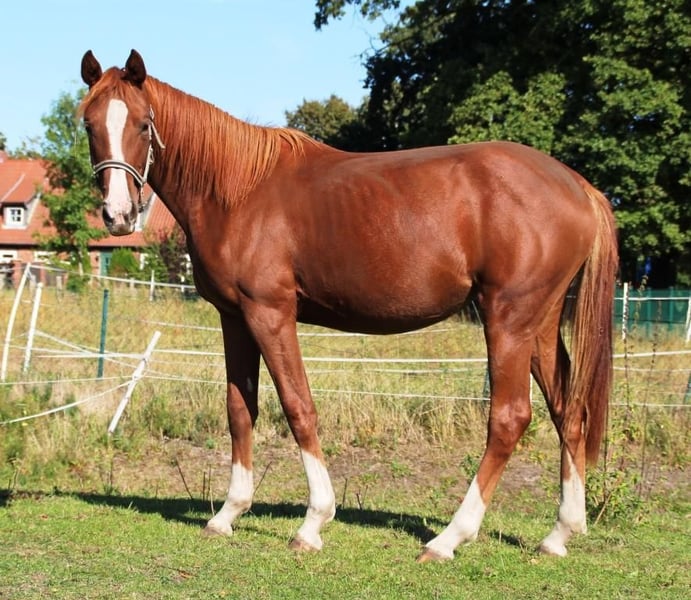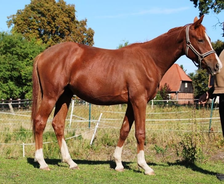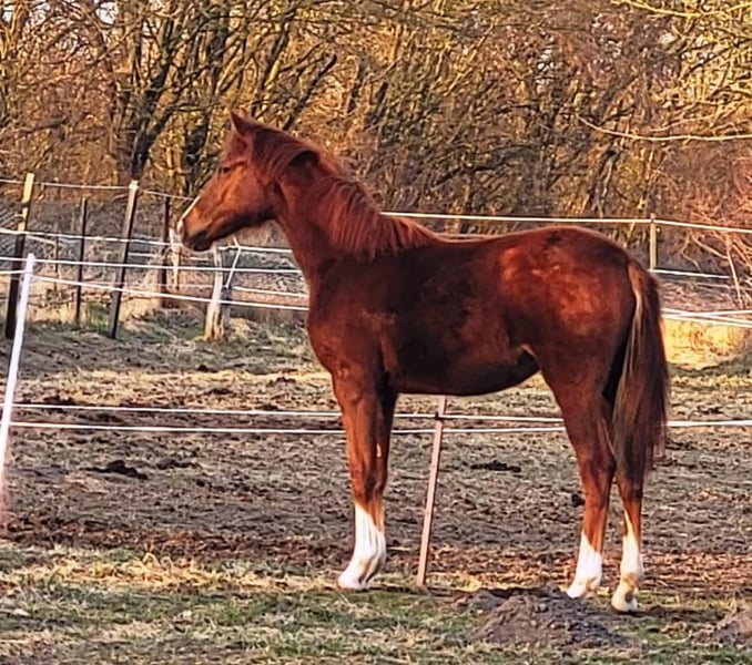 Zu verkaufen ist unsere 1 ,5 jährige Dressurnachwuchsperle Samira (geboren März 2024). Ihre Dressurabstammung lässt nicht zu wünschen übrig mit u.a. Belissimo M, His Highness, De Niro, Secret und Don Schufro. Auch ihre Urgroßmutter Carmina Burana, die 3 jährige Bundessiegerstute gewesen ist, findet sich in Samira wieder. Sie ist immer artig, menschenbezogen und unkompliziert. Liebt es auch von Kindern bespaßt zu werden und auch Kuscheleinheiten sind sehr willkommen. Sie ist regelmäßig geimpft (Tet/Infl), entwurmt und Hufe gemacht. Sie steht bei uns in einer gemischten Stutenherde ganzjährig draußen (Winter Offenstall / Weidezelt) und spielt gerne mit den anderen Jungspunden in unserer Herde. Ihr geschätztes Endmaß liegt zwischen 165 und 170 cm. Sie wurde bereits auf der Fohlenschau für ihre guten GGA, Taktsicherheit und Elastizität gelobt. Lassen Sie sich bei einem persönlichen Kennenlernen von dieser tollen Jungstute bezaubern. Sie wird nur abgegeben, da wir noch eine Vollschwester haben. Gerne einfach melden unter: 0176-78879276