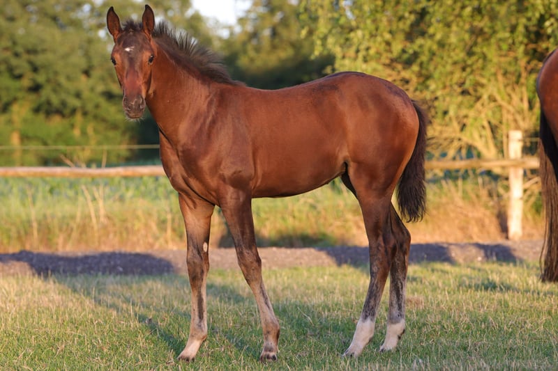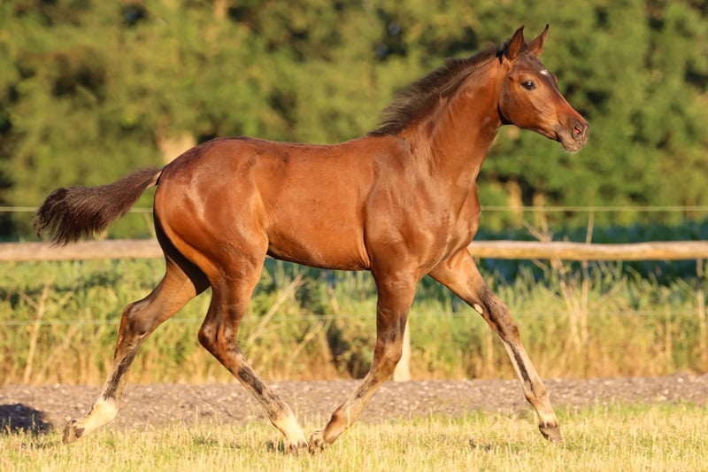 Exceptional filly with a promising pedigree, showing a friendly, curious, and open demeanor in daily handling. She already impresses with three above-average basic gaits. Her correct conformation and friendly, open character make her a true prospect for the future in dressage. She is healthy, well-developed, and is growing up in a species-appropriate environment. Her sire, St. Emilion, is a modern, high-performance Oldenburg premium stallion with an international pedigree, excellent basic gaits, and high breeding value. He represents the highest dressage quality and is already setting standards in breeding and sport. He captivates with elegance, rhythm, and impulsion, as well as a first-class pedigree that leaves nothing to be desired. St. Emilion is considered exceptionally rideable, eager to perform, and cooperative. He impresses with a natural uphill tendency, energetic take-off, and relaxation. The dam is by Don Frederico and was herself successful up to L-level dressage, further emphasizing the athletic quality of this foal. For any questions, please feel free to contact us by phone or WhatsApp at 0173/6048021.