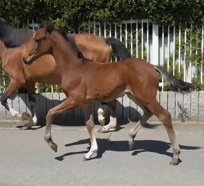 Expressive, spirited filly by Be My Dancer out of a proven mare line Jonson x Florencio For sale is an eye-catching, very correctly conformed filly by Be My Dancer (by Callaho’s Benicio x Vivaldi) out of a mare by Jonson x Florencio. The foal impresses with its harmonious, compact appearance, finely drawn lines, and above-average movement quality. Energetic and lively movement: powerful, springy gait with plenty of freedom of movement and natural balance. Compact athletic build: muscular, correctly founded, and consistently well-grown. Typey & evenly developed: elegant exterior with a clear topline and balanced growth. The sire, Be My Dancer, was awarded as a Westphalian Premium Stallion and Endring Champion. He is by Callaho’s Benicio (including Bundeschampion and Grand Prix winner) out of Vivaldi, one of the most influential dressage sires of recent years. He completed his 50-day test with a final score of 8.76, including a 9.0 for walk and rideability. His offspring are known for high rideability, mechanics, and willingness to perform. The mare combines two proven sire lines, Jonson (Jazz line) and Florencio (Florestan x Weltmeyer), known for their dynamism, strong character, and dressage quality. The granddam (by Florencio x Oliver) and further descendants from this line are active in our breeding program – we are convinced of the lasting inheritance strength of this lineage, especially regarding rideability, substance, and movement quality. In summary: An exceptionally correct, muscular, and compact dressage foal with outstanding movement ability and a lot of charisma – ideal for breeders and riders with high expectations regarding athleticism, type, and development potential. Location: North Rhine-Westphalia. Viewings by arrangement at any time. For questions or further information, please do not hesitate to contact us.