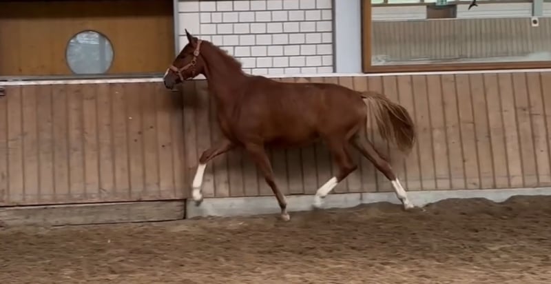 This expressive chestnut mare by Maxim x Dannebrog x Pik Bube impresses with her correct conformation, strong bones, and already well-developed, harmonious physique. "Mylady" is a particularly attractive yearling chestnut mare with a light, almost blonde mane and a friendly, open demeanor. She is consistently well-behaved in daily handling, halter-trained, and has mastered the basics of foal training. In movement, she displays a lively, rhythmic trot with plenty of cadence and natural balance. A charming young mare with excellent potential for a future career in sport or breeding.