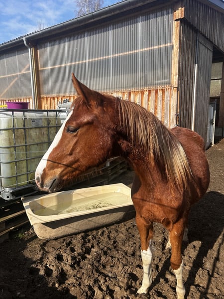 Die Stute steht bei uns in unserer Stutenherde im Sommer 24h auf der Weide und aktuell im Großen Laufstall mit Aussenpaddock und kann jederzeit besichtigt werden.