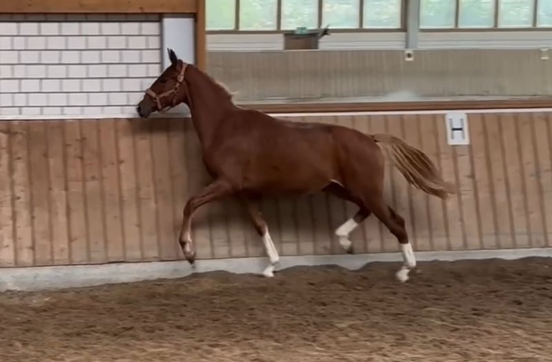 Diese ausdrucksvolle Fuchsstute von Maxim x Dannebrog x Pik Bube überzeugt durch ihr korrektes Fundament, stabile Knochen und ihre bereits weit entwickelte, harmonische Statur. Sehr kräftiges Pferd!!!!! Sehr großer Jährling mit einem kräftigem Fundament. „Mylady“ ist eine besonders hübsche Jährlingsfuchsstute mit heller, fast blonder Mähne und einem freundlichen, offenen Wesen. Sie zeigt sich im täglichen Umgang stets brav, ist halfterführig und beherrscht das Fohlen-ABC. In der Bewegung präsentiert sie sich schwungvoll und taktsicher, mit viel Gleichmaß und natürlicher Balance. Eine charmante Nachwuchsstute mit tollen Voraussetzungen für den weiteren Weg im Sport oder in der Zucht.