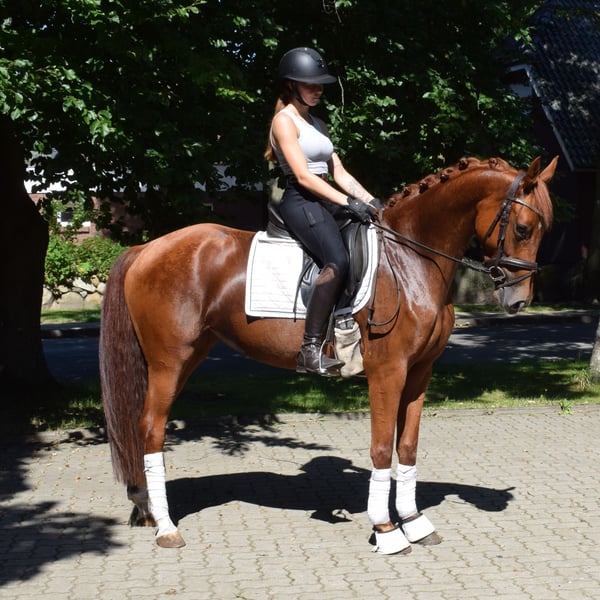 A horse that you can hardly imagine better. Top rideable, always by the side of its rider. Affectionate, clingy, simply a great buddy that will excel in all equestrian disciplines, whether dressage, jumping, or cross-country. Additionally, she is equipped with three good basic gaits and jumping ability. Under saddle and in handling, she is uncomplicated. Test rides possible at any time by arrangement. More information and videos can be found on our homepage. Hof Heisterbusch Team.