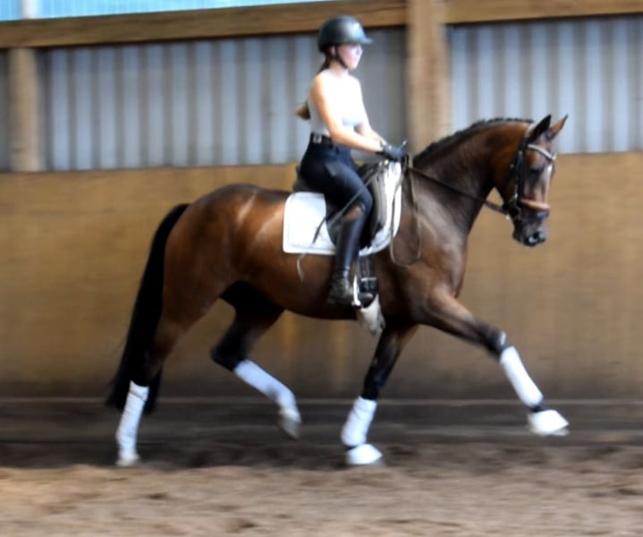 A rare find in a dancer! Beautiful, expressive mare equipped with a very ground-covering walk, an uphill canter, and a lively trot with highly active hind legs and willingness to collect. Vajana has an excellent character and is very easy to ride and eager to learn. She is a horse that can undoubtedly be trained wonderfully. She is perfectly suited for both demanding dressage sport and amateur riders. She is well-trained for her age and on the way to becoming a dressage horse at level A. Vajana is ridden both indoors and on the outdoor arena and always presents herself as very uncomplicated. Currently standing at 1.64 meters and still growing. Thanks to her very correct conformation and well-set neck, she appears larger under the rider and comfortably carries bigger riders. Trial rides are available at any time by arrangement. More information can be found on our homepage. Hof Heisterbusch Team