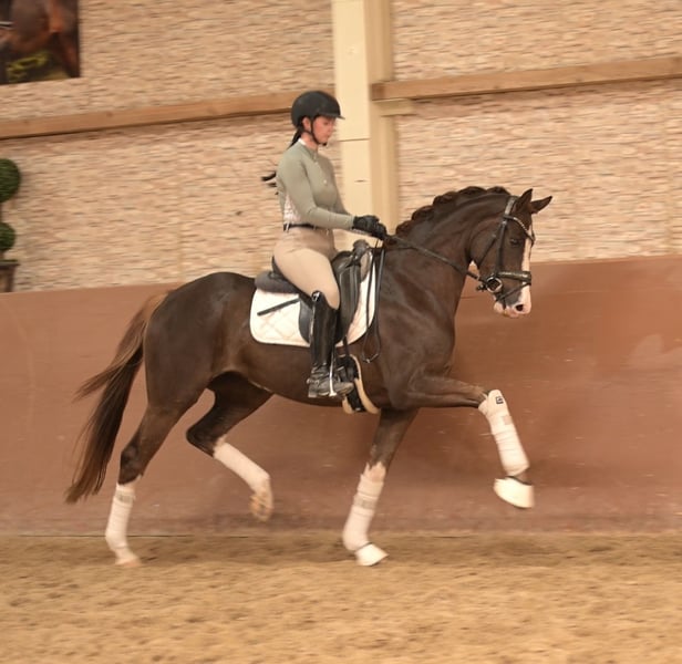 Liebe Interessenten, Ausführliche Videos versende ich gerne auf Anfrage per WhatsApp 00491713438949 Für Terminvereinbarungen Probereiten senden Sie mir bitte eine WhatsApp. Für weitere Fragen bin ich tagsüber per WhatsApp erreichbar, telefonisch erreichen Sie mich am Besten zwischen 16 und 19 Uhr. Ich freue mich auf eine Kontaktaufnahme www.angelina-devittorio.de ⭐️ Zalina ⭐️ • Alter: 4 Jahre (2022) • Größe: ca. 1,65 m Abstammung: Zoom x Sir Donnerhall • Ausbildungsstand: angeritten • AKU: gute AKU incl Röntgenbilder vorhanden Zum Verkauf steht eine traumhaft schöne, vierjährige Dunkelfuchsstute von Zoom, die sowohl durch ihre herausragende Qualität als auch durch ihre außergewöhnliche Optik begeistert. Dieser hochveranlagte Youngster präsentiert sich trotz der kurzen Zeit (ca 2,5 Monate) unter dem Sattel schon sehr Kopfklar und unkompliziert , wodurch sie sowohl im täglichen Umgang als auch unter dem Sattel überzeugt. Trotz ihres jungen Alters ist sie sehr angenehm zu reiten, verfügt über ein gutes, komfortables Go und vermittelt ihrem Reiter stets ein tolles Gefühl. Hier wächst ein außergewöhnlich talentiertes Nachwuchspferd mit vielversprechender Perspektive für das große Viereck heran, das durch ihre atemberaubende, auffällige Optik und hervorragende Qualität besticht. Die Stute stammt aus einem hocherfolgreichen Mutterstamm, daher auch super interessant für die Zucht ⚜️Tel: 0171-3438949 ⚜️a.devittorio@web.de ⚜️https://www.ehorses.de/angelinadevittorio Facebook und Instagram Angelina De Vittorio Videos bitte per WhatsApp 00491713438949