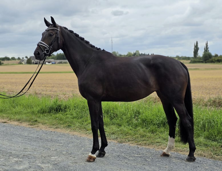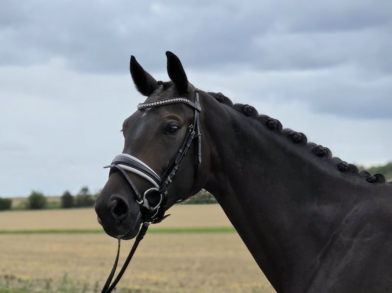 Four-year-old compact young horse with an actively stepping hind leg and a good work ethic. Still fully in development, Norla is recommended for ambitious dressage riders looking for a horse of medium frame. With a height of 166 cm, she is ideally suited as a ladies' horse or for riders who are not too tall, but she also accommodates larger riders well (rider in the video is 190 cm). Norla is light on her legs and easy in the contact, and she is an absolutely honest horse with good forward movement. The riding experience in the canter is particularly noteworthy. Here, she always jumps uphill and far under the center of gravity. Norla has been presented once in a riding horse competition. The first competition experience was uncomplicated in all aspects. A radiographic examination was done when she was two years old.