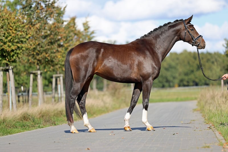 Direkt vom Aufzüchter und bereits geröntgt: Viermal weiß, tief dunkelbraun, herausragend proportioniert, einfach wunderschön - das ist Frieda. Wenn sie nur schon über den Hof geführt wird, schaut man immer wieder hin und erfreut sich an ihrem Anblick. Auch im Umgang mag man diesen Schatz gerne um sich haben. Frieda ist dem Menschen sehr zugetan und wartet schon immer, dass sie auch endlich von der Weide zur Arbeit geholt wird. Und wo das Glück der Erde liegt, weiß man, wenn man auf ihr Platz nimmt - sie ist exzellent zu reiten und ein echtes Wohlfühlpferd, da stimmt einfach alles. Zudem hat Frieda drei Grundgangarten, mit denen ihr alle Türen offenstehen, sowie ein starkes Nervenkostüm, was sie bereits im Gelände alleine und in der Gruppe sowie unter unserer jugendlichen Testreiterin (A-Niveau) bewiesen hat. Frieda ist Vollschwester des in Hannover gekörten Hengstes Ferrero. Sie stammt aus dem ersten Jahrgang des Celler Landbeschälers und Prämienhengstes Friedrich der Große, der wiederum ein Sohn des S***-erfolgreichen For Romance II ist, der mit einem Zuchtwert von 145 zur Spitze der Top-Jungpferdevererber gehört. Ihre Mutter, die Hengstmutter Fiorenza, stammt ab von Fürst Nymphenburg, der ebenfalls einen exzellenten Zuchtwert von 132 für Jungpferde mitbringt. Gute Röntgenbilder liegen vor. Sie finden uns nur 30 Minuten von Berlin entfernt, wo wir Frieda von Fohlen an in unserem Landwirtschaftsbetrieb auf großen Wiesen im Herdenverband artgerecht aufgezogen haben. Wenn Sie Frieda und unsere anderen Nachwuchspferde kennenlernen oder mehr erfahren möchten, freuen wir uns über Ihren Anruf unter 03301 577 2585! *** Der Weg lohnt sich! Weitere Nachwuchspferde siehe unten in unseren anderen Inseraten. ***