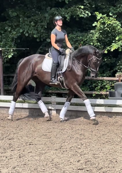 Wunderschöne typvolle Rappstute aus 1. Hand in beste Hände zu verkaufen. Ein Pferd, welches durch die imposante Erscheinung überall auffällt. Sie befindet sich in einem der renommiertesten Ausbildungsställe in NRW und genießt hier die perfekte Ausbildung, die sich ein Pferd wünschen kann. Sie ist 4,5 Jahre alt, ca. 1,70 Mund befindet sich auf A Niveau. Sie ist draussen wie drinnen zu reiten und will immer alles richtig machen. Bocken und Steigen kennt sie absolut nicht. Mit anderen Pferden sehr umgänglich, auch auf der Weide. Vater Kjento ist Doppel-Weltmeister der 6- und 7-jährigen Dressurpferde (Ermelo 2021 & 2022). Kjento begeistert durch moderne Linienführung, bestechenden Typ sowie Grundgangarten auf Weltklasse-Niveau. Mittlerweile ist er international unter Charlotte Fry gesiegt. Ihre Mutter war selbst hocherfolgreich in S Dressuren platziert und stammt aus bester Linienführung. Ein guter Röntgentüv einschließlich Rücken liegt vor. Um dieses tolle Pferd zu schonen, wird eine Schutzgebühr für das Vorstellen/ Probereiten der Stute in Höhe von 50 Euro erhoben, die natürlich bei Kauf verrechnet werden. Standort: Krefeld / NRW Wegen Aufgabe des Reitsports: Preis: 27.500 E