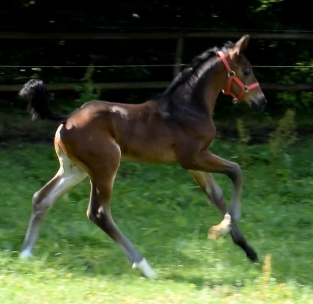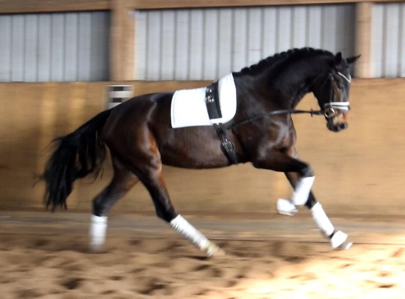 A fantastic training horse with exceptional quality for the dressage arena and an unbeatable character! She has beautiful movement and is very easy to work with. Lady Elchi is backed and always provides the rider with an excellent riding experience. Equipped with plenty of energy, she already shows great potential. She is also a real sweetheart in handling and is open to any kind of fun. Lady Elchi was born with us and grew up in a herd of her peers. A first video under saddle can be sent upon request. Lady Elchi is starting the behavior she exhibited as a foal. This behavior has not negatively affected her performance or health under the rider, and it does not impair her performance or well-being. For this reason, we are selling this exceptional mare well below her value.